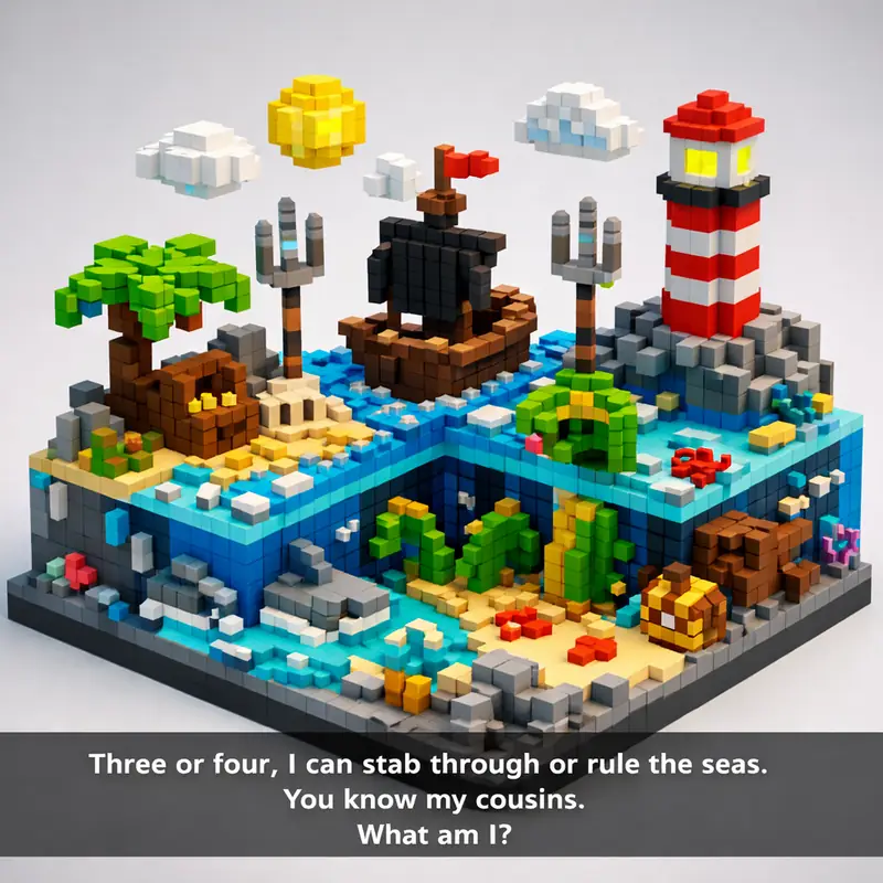 Three or four, I can stab through or rule the seas. You know my cousins. What am I?