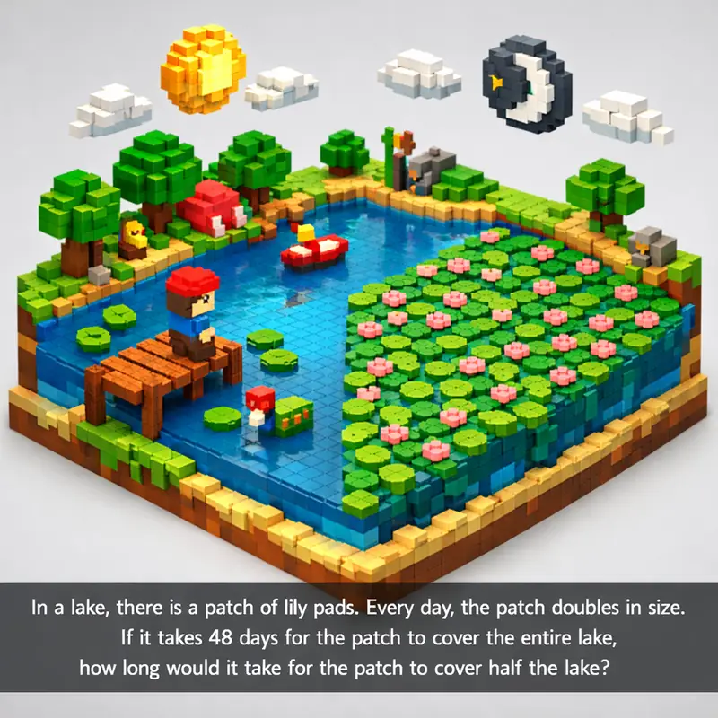 In a lake, there is a patch of lily pads. Every day, the patch doubles in size. If it takes 48 days for the patch to cover the entire lake, how long would it ta...