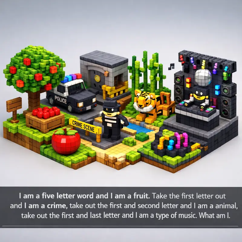 I am a five letter word and I am a fruit. Take the first letter out and I am a crime, take out the first and second letter and I am a animal, take out the first...
