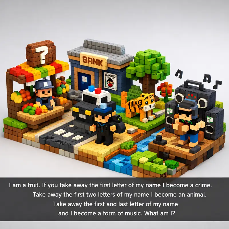 I am a fruit. If you take away the first letter of my name I become a crime. Take away the first two letters of my name I become an animal. Take away the first...