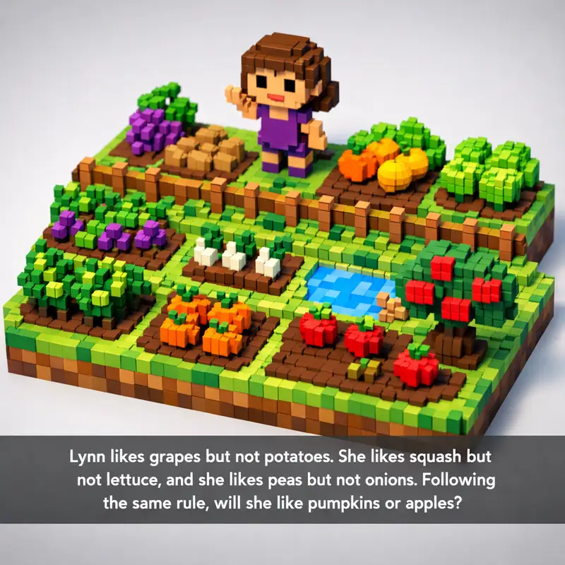 Lynn likes grapes but not potatoes. She likes squash but not lettuce, and she likes peas but not onions. Following the same rule, will she like pumpkins or appl...