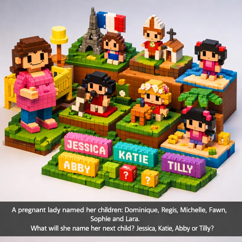 A pregnant lady named her children: Dominique, Regis, Michelle, Fawn, Sophie and Lara. What will she name her next child? Jessica, Katie, Abby or Tilly?