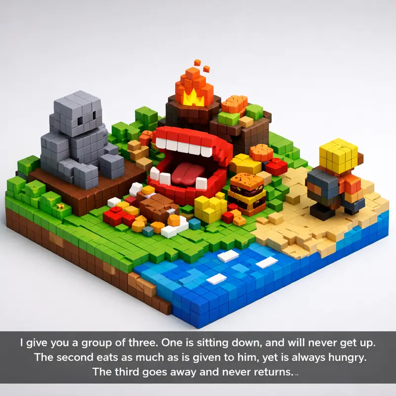 I give you a group of three. One is sitting down, and will never get up. The second eats as much as is given to him, yet is always hungry. The third goes away a...