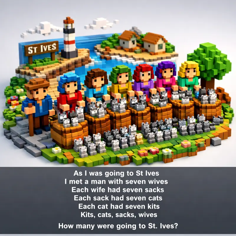 As I was going to St Ives I met a man with seven wives Each wife had seven sacks Each sack had seven cats Each cat had seven kits Kits, cats, sacks, wives How m...
