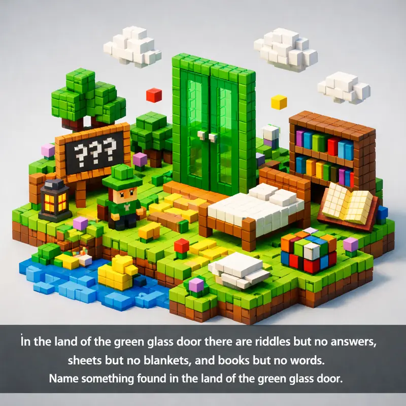 In the land of the green glass door there are riddles but no answers, sheets but no blankets, and books but no words. Name something found in the land of the gr...