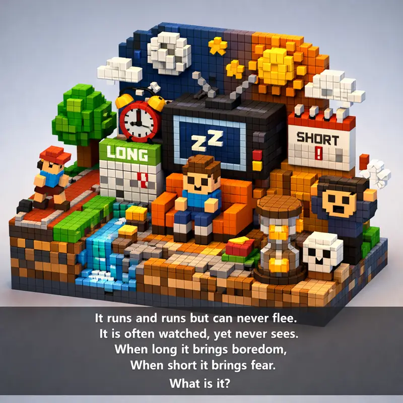 It runs and runs but can never flee. It is often watched, yet never sees. When long it brings boredom, When short it brings fear. What is it?