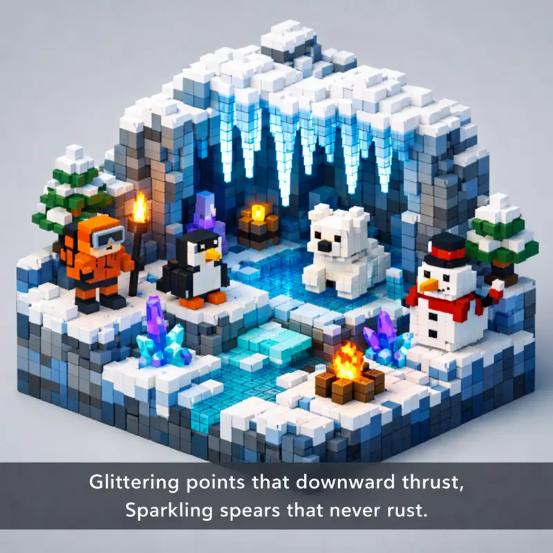 Glittering points that downward thrust, Sparkling spears that never rust.