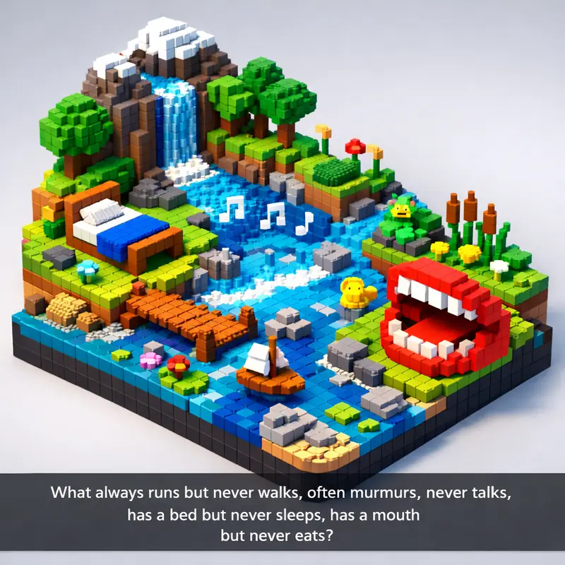 What always runs but never walks, often murmurs, never talks, has a bed but never sleeps, has a mouth but never eats?