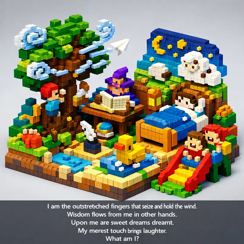 I am the outstretched fingers that seize and hold the wind. Wisdom flows from me in other hands. Upon me are sweet dreams dreamt. My merest touch brings laughte...