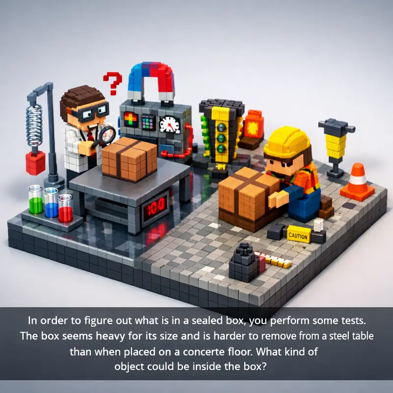 In order to figure out what is in a sealed box, you perform some tests. The box seems heavy for its size and is harder to remove f...