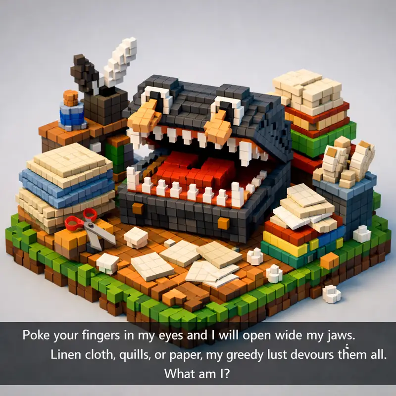 Poke your fingers in my eyes and I will open wide my jaws. Linen cloth, quills, or paper, my greedy lust devours them all. What am...