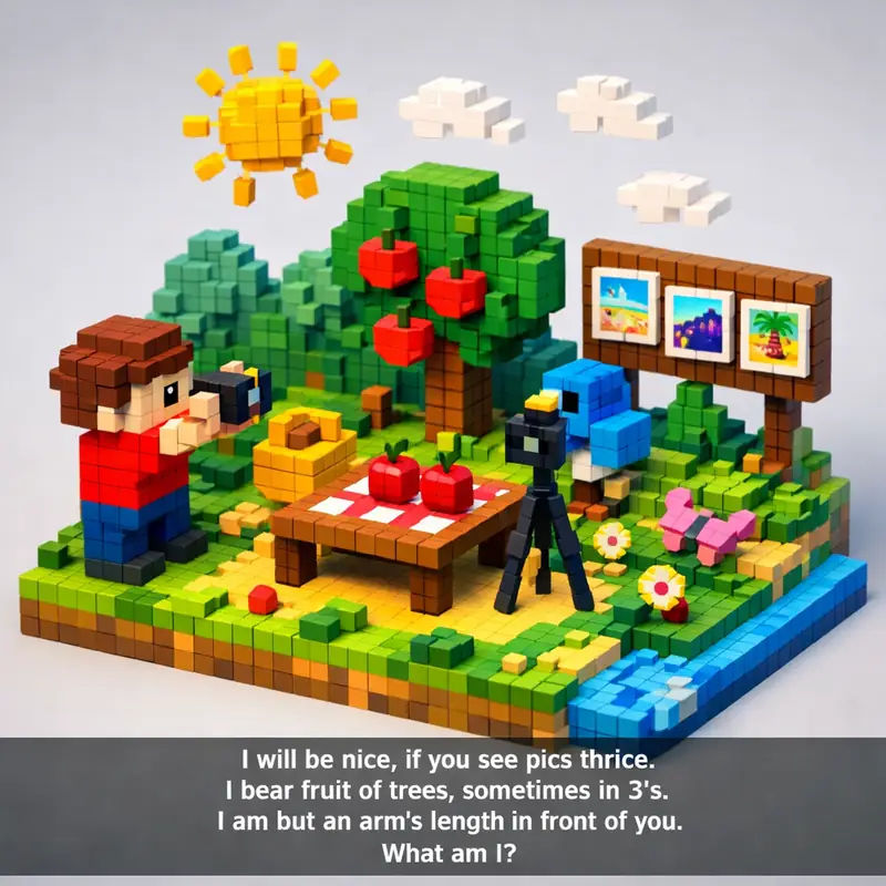 I will be nice, if you see pics thrice. I bear fruit of trees, sometimes in 3's. I am but an arm's length in front of you. What am I?