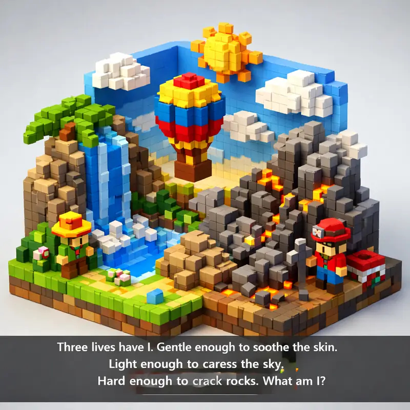 Three lives have I. Gentle enough to soothe the skin. Light enough to caress the sky. Hard enough to crack rocks. What am I?