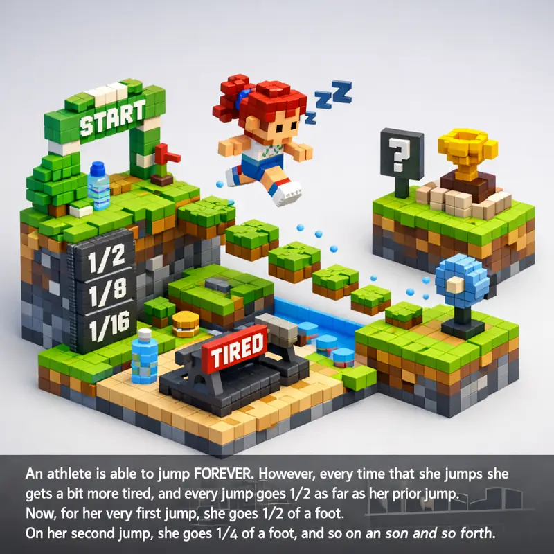 An athlete is able to jump FOREVER. However, every time that she jumps she gets a bit more tired, and every jump goes 1/2 as far as her prior jump. Now, for her...